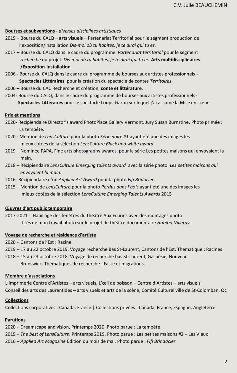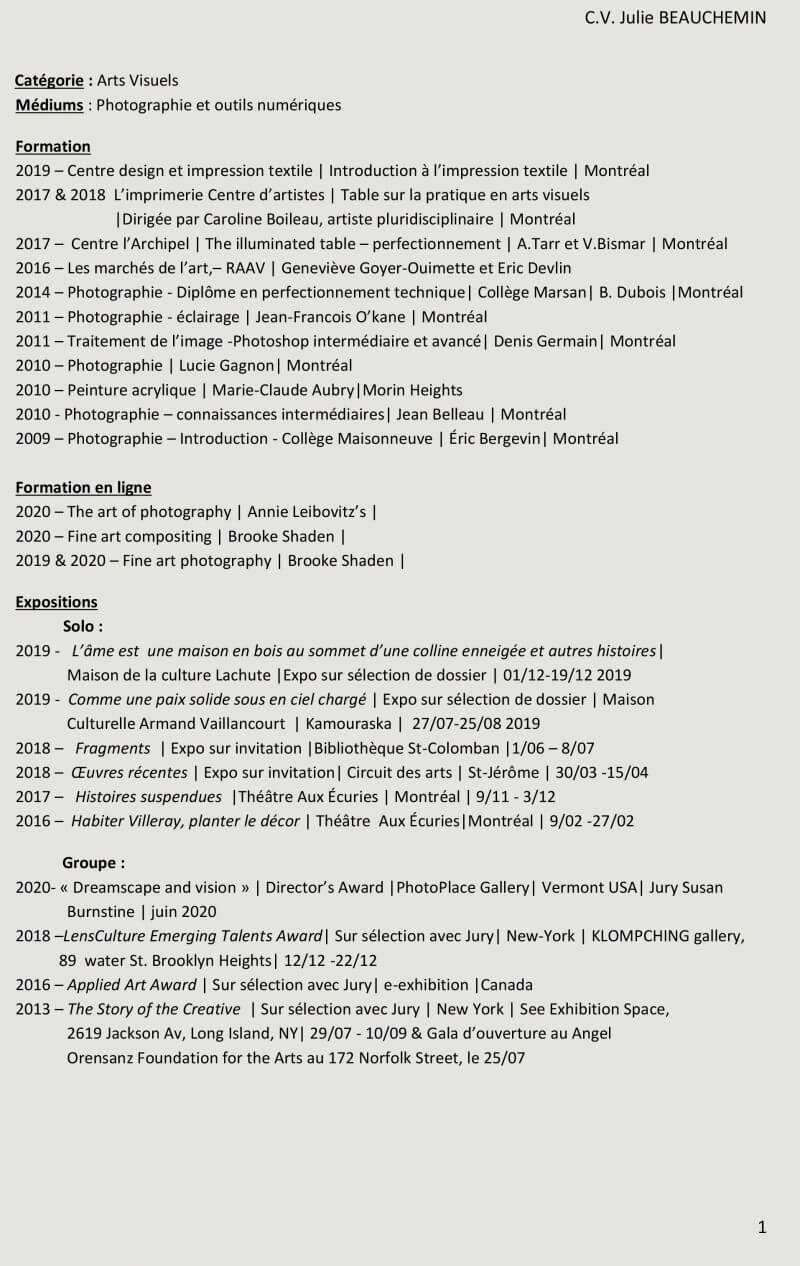 Raconter des histoires fait partie de mon parcours. D’abord formée aux arts vivants, dès ma sortie de l’École d’interprétation de St-Hyacinthe en 1997, je joue sur scène au théâtre. Viennent ensuite des rôles à la télévision, puis depuis près de 15 ans maintenant, je prête ma voix, pour le doublage de films, de séries et de dessins animés. J’ai co-fondé les soirées de création théâtrale La Langue à Terre, où les invités devaient créer des spectacles de 20 minutes en 20 heures, puis, pendant quelques années, j’ai gravité autour du milieu du conte Montréalais, j’ai écrit des contes et monté des spectacles en tant que conteuse, coach et metteur en scène. La photo est arrivée dans ma vie il y a environ 10 ans. J’ai suivi plusieurs ateliers et formations (discussion autour de la pratique artistique en arts visuels à L’Imprimerie Centre d’artistes, par Caroline Boileau, diplôme en perfectionnement technique du Collège Marsan, intervention digitale avec Denis Germain etc). La photo est devenue, avec le temps une base de travail plus qu’une finalité (voir ma démarche). J’utilise des images banales que je tente de magnifier par l’intervention digitale. Comme lors d’une pièce de théâtre où une scène quotidienne magnifiée par les mots choisis, la mise en scène, le drame ou la comédie, sort de son aspect local pour trouver un écho plus large. La photo est elle aussi, une discipline artistique qui me permet de raconter des histoires. De dire des lieux, des vies, des sentiments. Réels ou inventés.